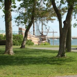 The replica ship Mayflower II, built in 1957, is docked near Plymouth Rock and maintained by the museum.